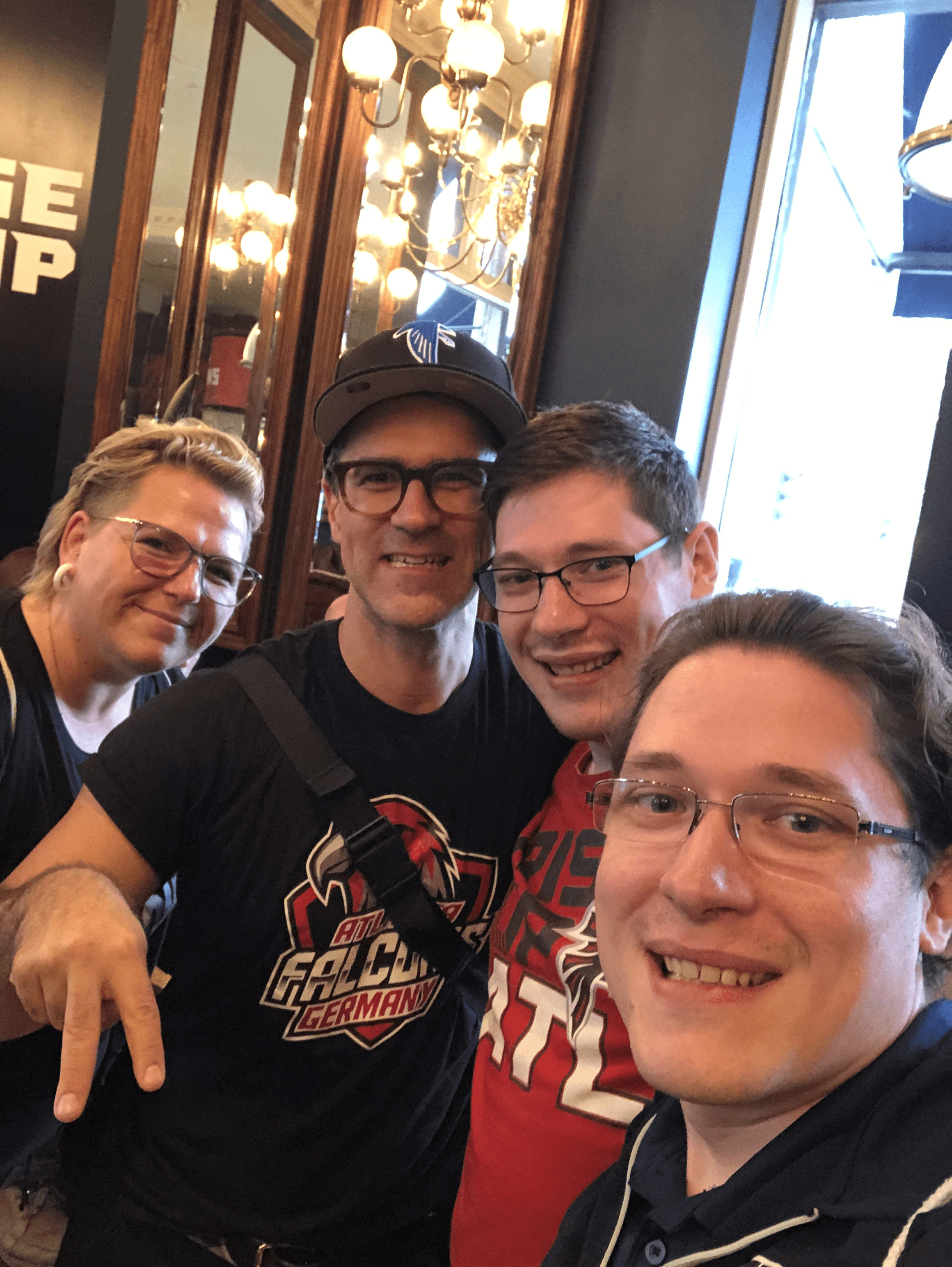 Die Atlanta Falcons haben eine eigene Fanparty mit Cheerleader und dem Maskottchen Freddy Falcon organisiert. Die Bewerbung des Events wurde unter anderem vom deutschen Fanclub Atlanta Falcons Germany beworben und so haben wir auch das Team dort getroffen. Schön war natürlich, dass ich mit meinem Patriots-Hoodie um genau 3:28 Uhr nachmittags in den Pub eingezogen bin (war natürlich reiner Zufall). Obwohl die Veranstaltung erst 2,5 Stundenspäter starten sollte, war der Pub schon gut gefüllt und die Stimmung sehr gut. Mein Patriots-Logo wurde schnell mit den Fanclub-Logos überklebt. Ich fand es lustig und ein Selfie war natürlich auch drin. Das Foto möchte ich euch aber nicht vorenthalten. Danke an alle, die dort dabei waren! Man merkt sofort, dass Football in Europa noch mehr Familie ist und es eher egal ist, zu welcher Franchise Mann/Frau hält.